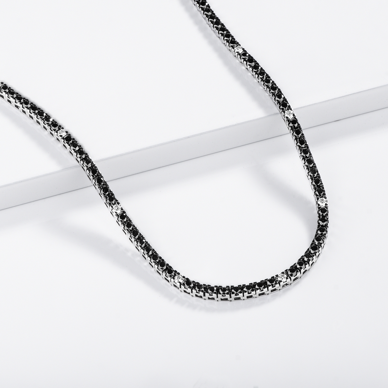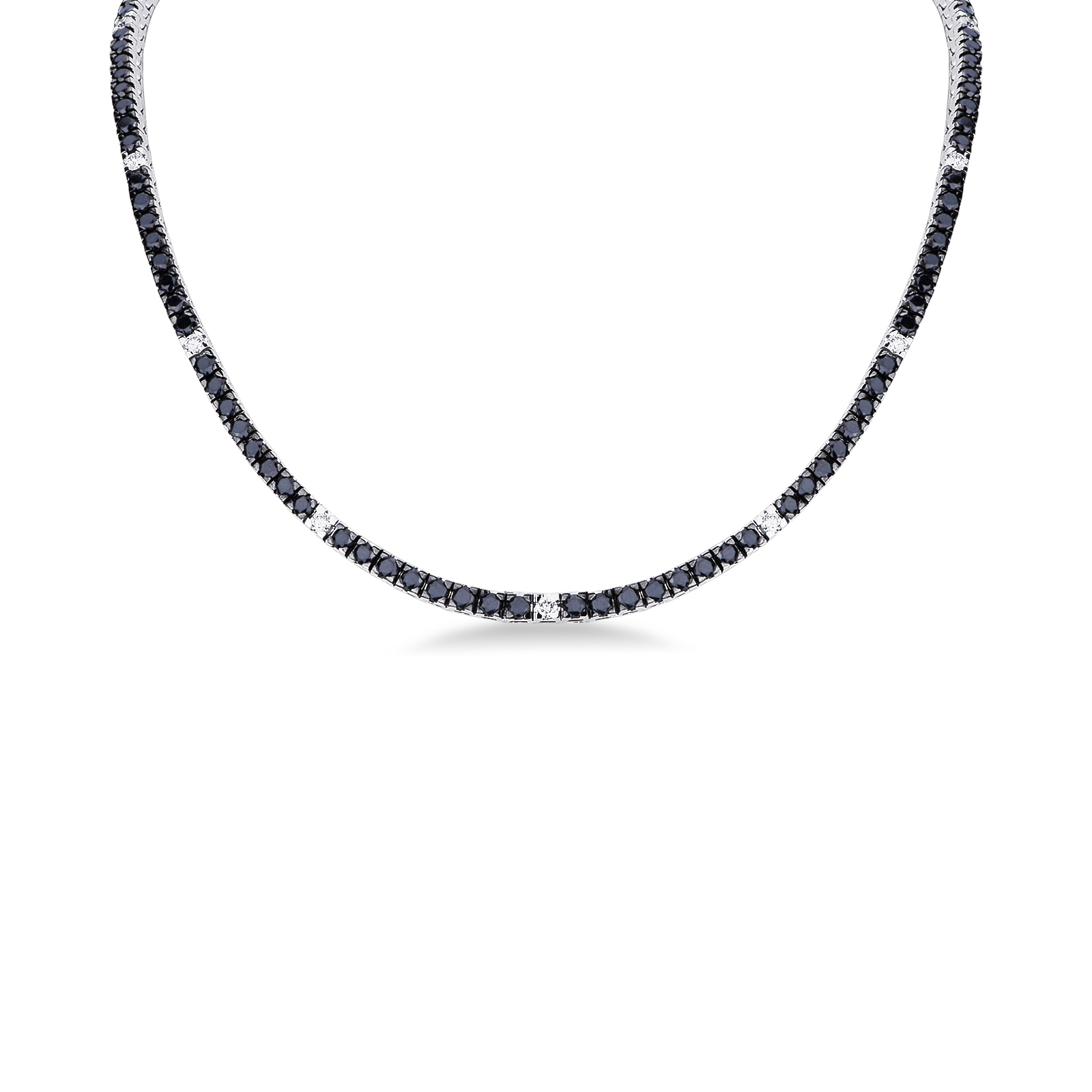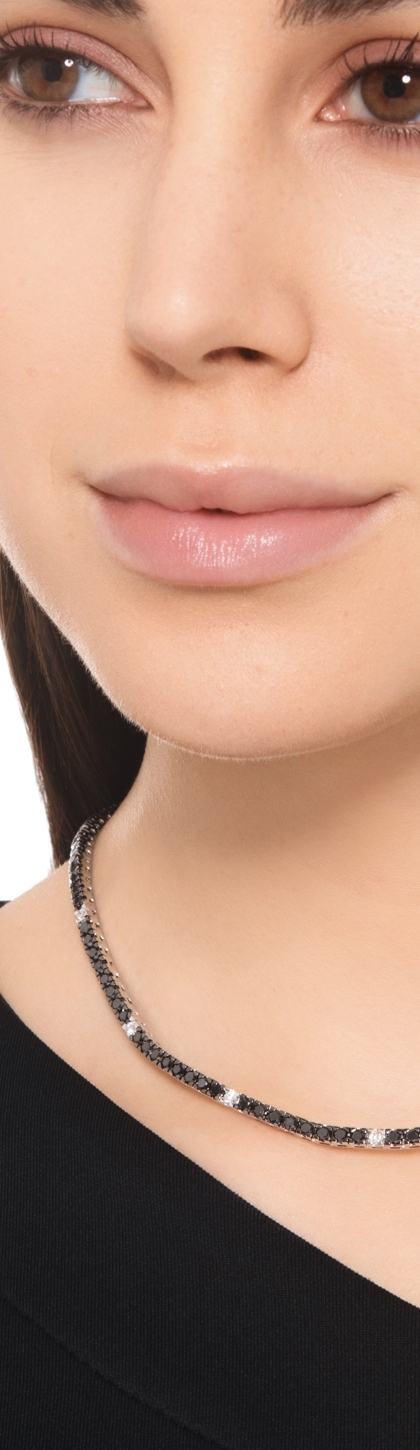 Este collar tennis con diamantes negros destaca por la sutil presencia de diamantes blancos que rompen la intensidad del color oscuro, aportando delicados destellos de luz. Realizado en oro de 18 quilates, es una joya que no pasa desapercibida. Los diamantes negros son perfectos para quienes desean diferenciarse sin renunciar a la elegancia y la sofisticación de un collar exclusivo. Además, los diamantes están engastados con garras bruñidas, lo que realza la profundidad del color y su encanto misterioso. Por último, este collar de diamantes combina a la perfección con collares colgantes para crear un look moderno y ecléctico.