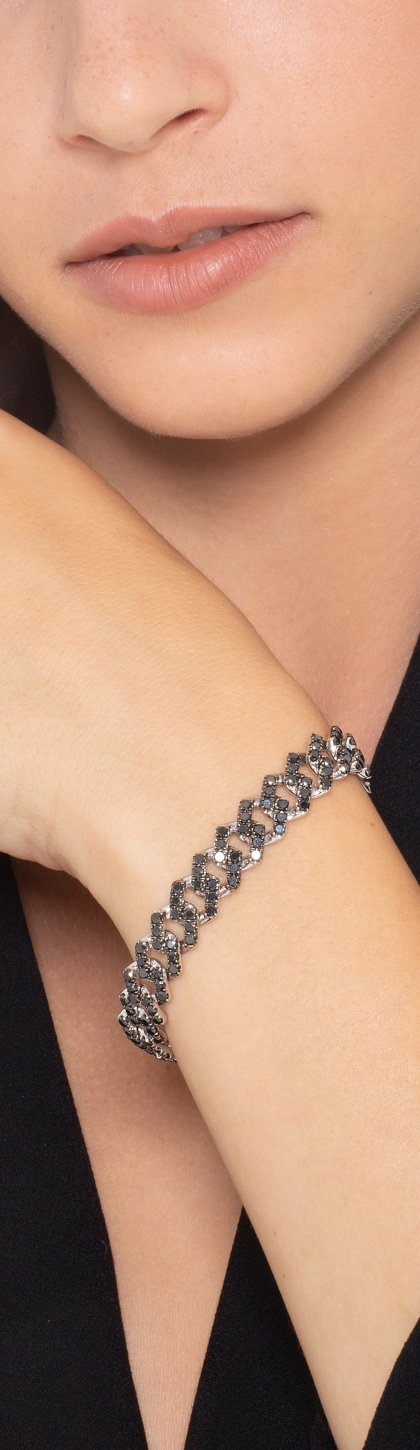Pulsera cubana de oro blanco 18k con diamantes negros. Puntas brunidas.