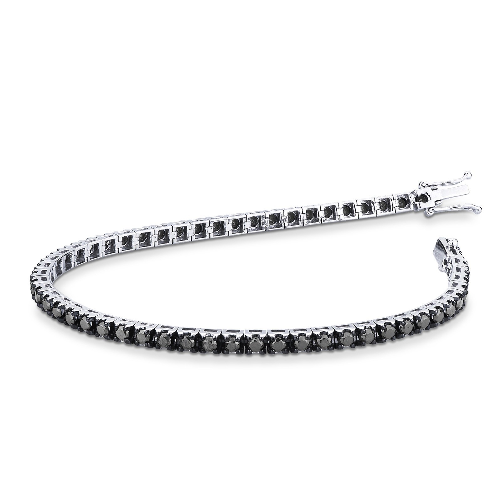 Pulsera tennis en oro blanco de 18 quilates con diamantes negros talla brillante sobre oro bruñido. El quilataje puede variar según la medida de la pulsera. Ancho aproximado de 3,10 mm.
