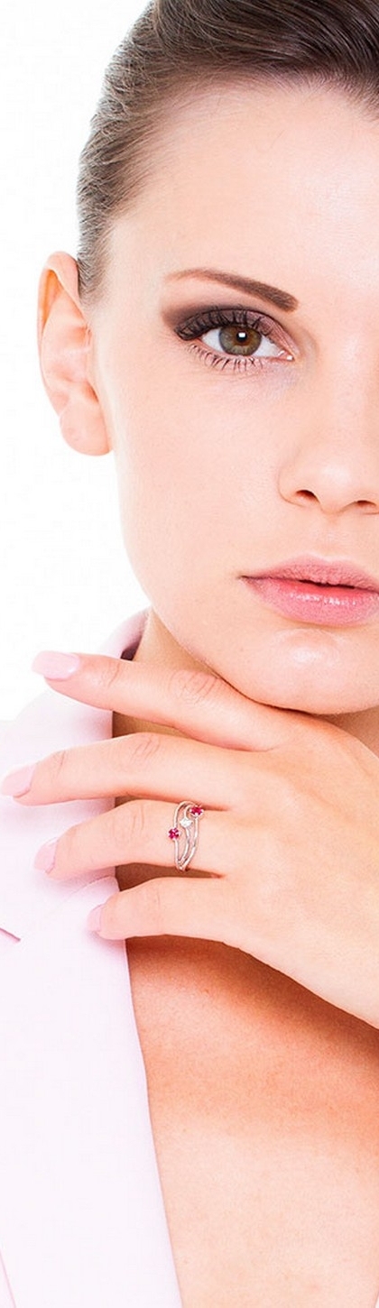 Anillo trilogía en oro blanco de 18 quilates con rubíes y diamante