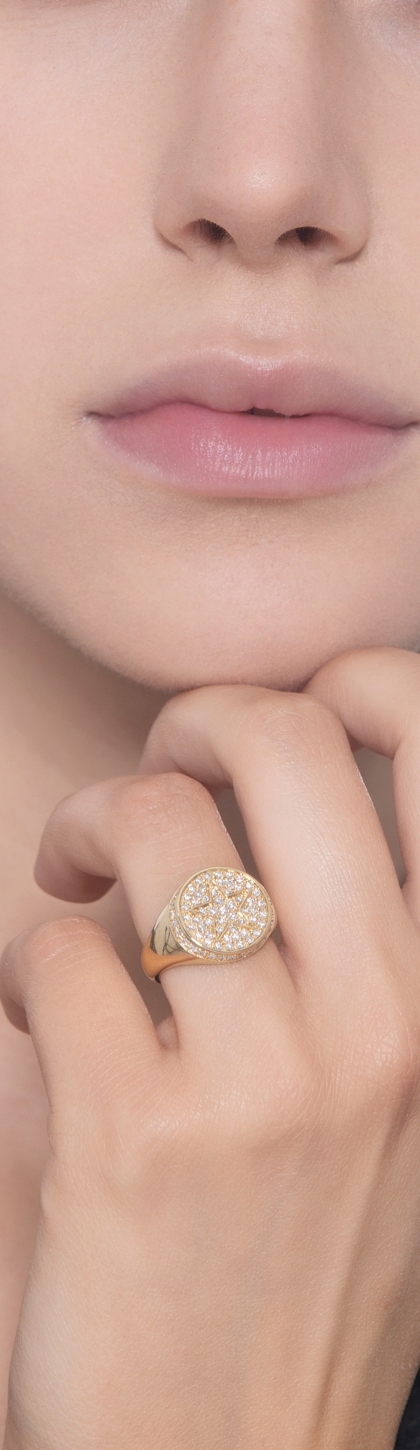 Anillo chevalier en oro amarillo 18k con estrella en relieve con pavé de diamantes