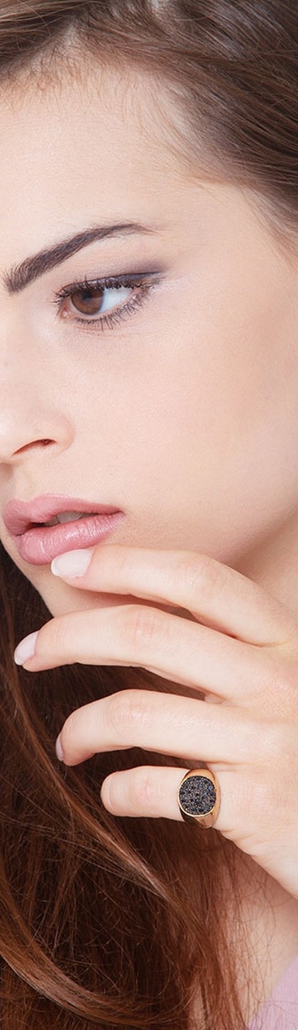 Anillo de meñique en oro amarillo de 18 quilates. La parte superior es ovalada con un pavé de diamantes negros de corte brillante.