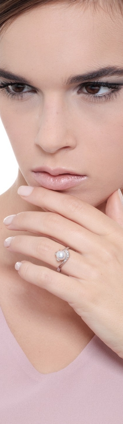 Anillo contrarié en oro blanco 18k con perla y diamantes