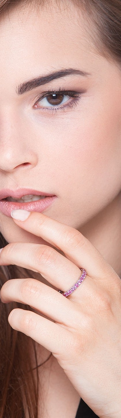 Anillo riviera en oro blanco de 18k con zafiros rosas