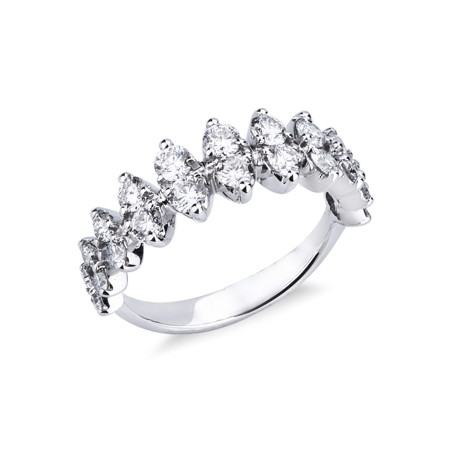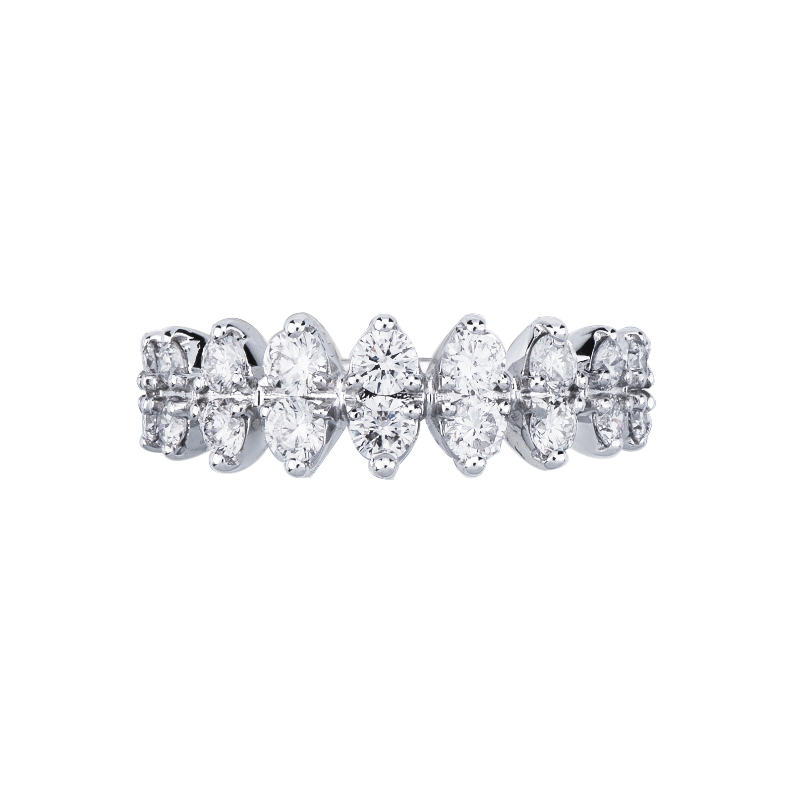 Anillo tipo alianza en oro blanco 18k con diamantes talla brillante en forma de navette dispuestos en degradé. Diamantes de color H y pureza VS. Una pieza sofisticada y elegante con diseño armonioso.