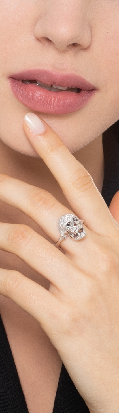 Anillo calavera en oro blanco 18 quilates diamantes blancos y negros