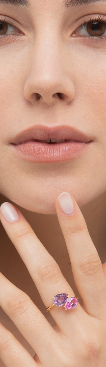 Anillo en oro amarillo 18k con zafiro rosa y amatista