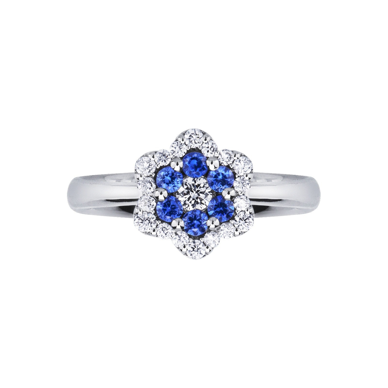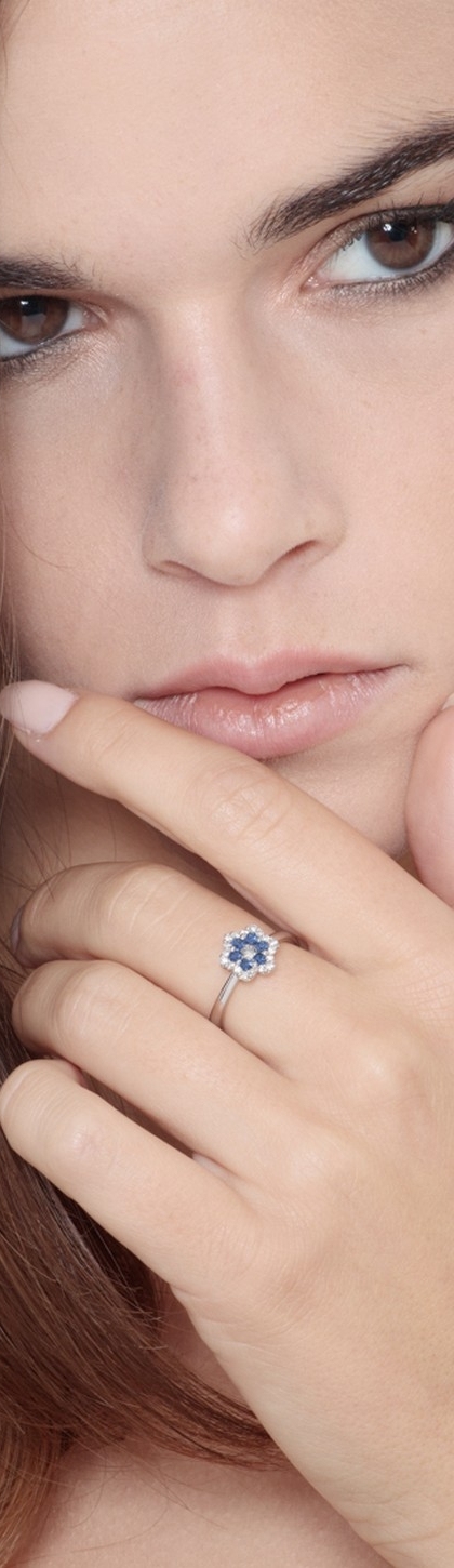 Anillo en oro blanco 18k con flor de diamantes y zafiro azul