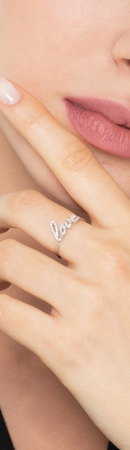 Anillo en oro blanco de 18k con la inscripción Love en diamantes