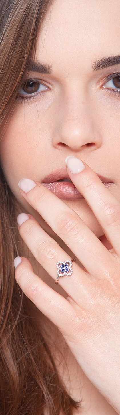Anillo en oro blanco de 18k en forma de flor con zafiros azules