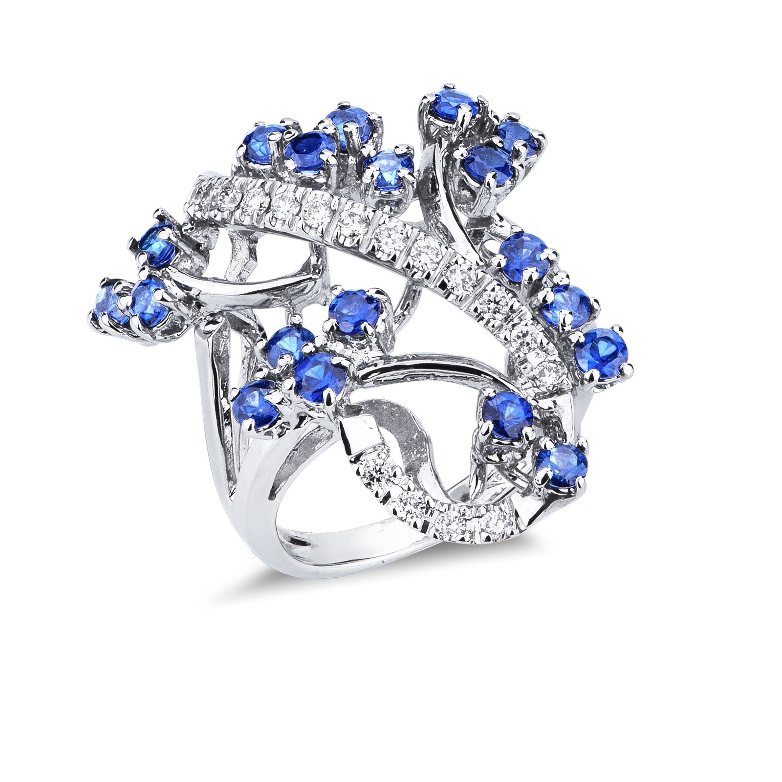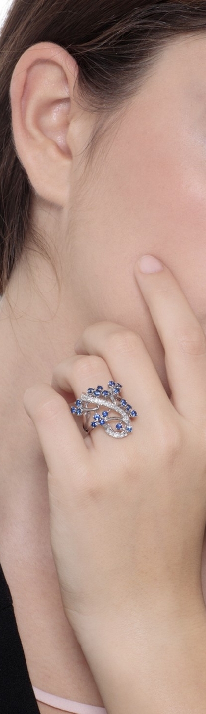 Anillo fantasia en oro blanco 18k con zafiros azules y diamantes