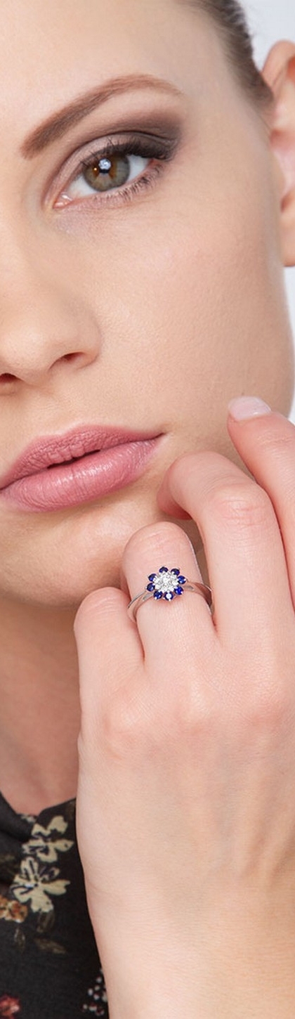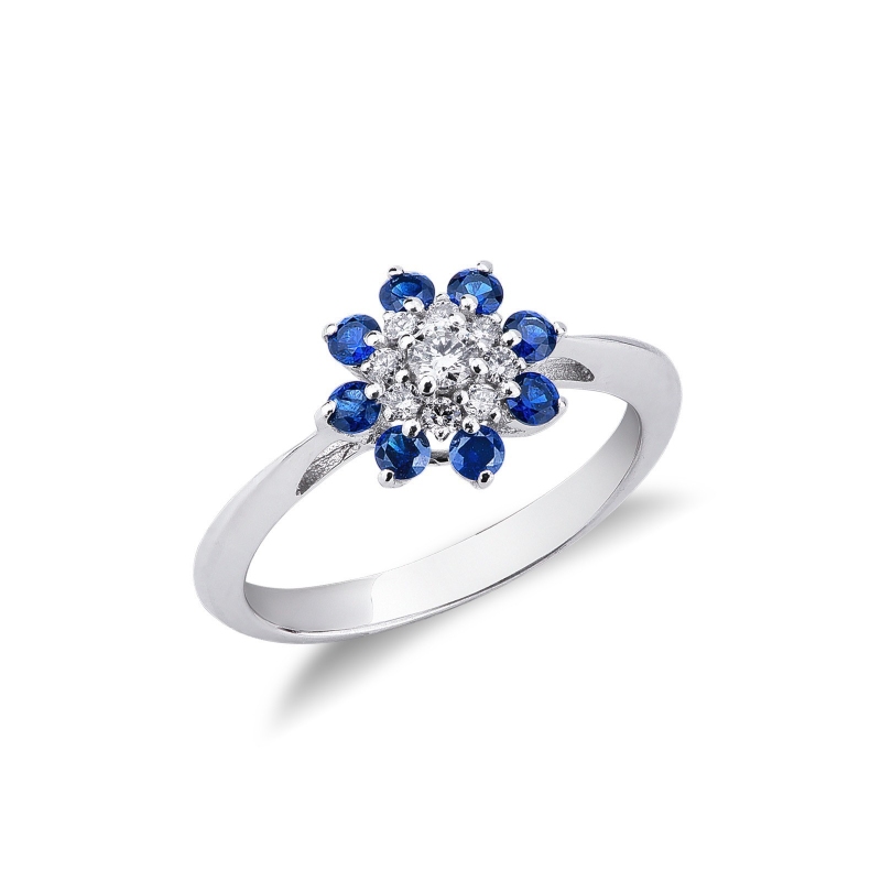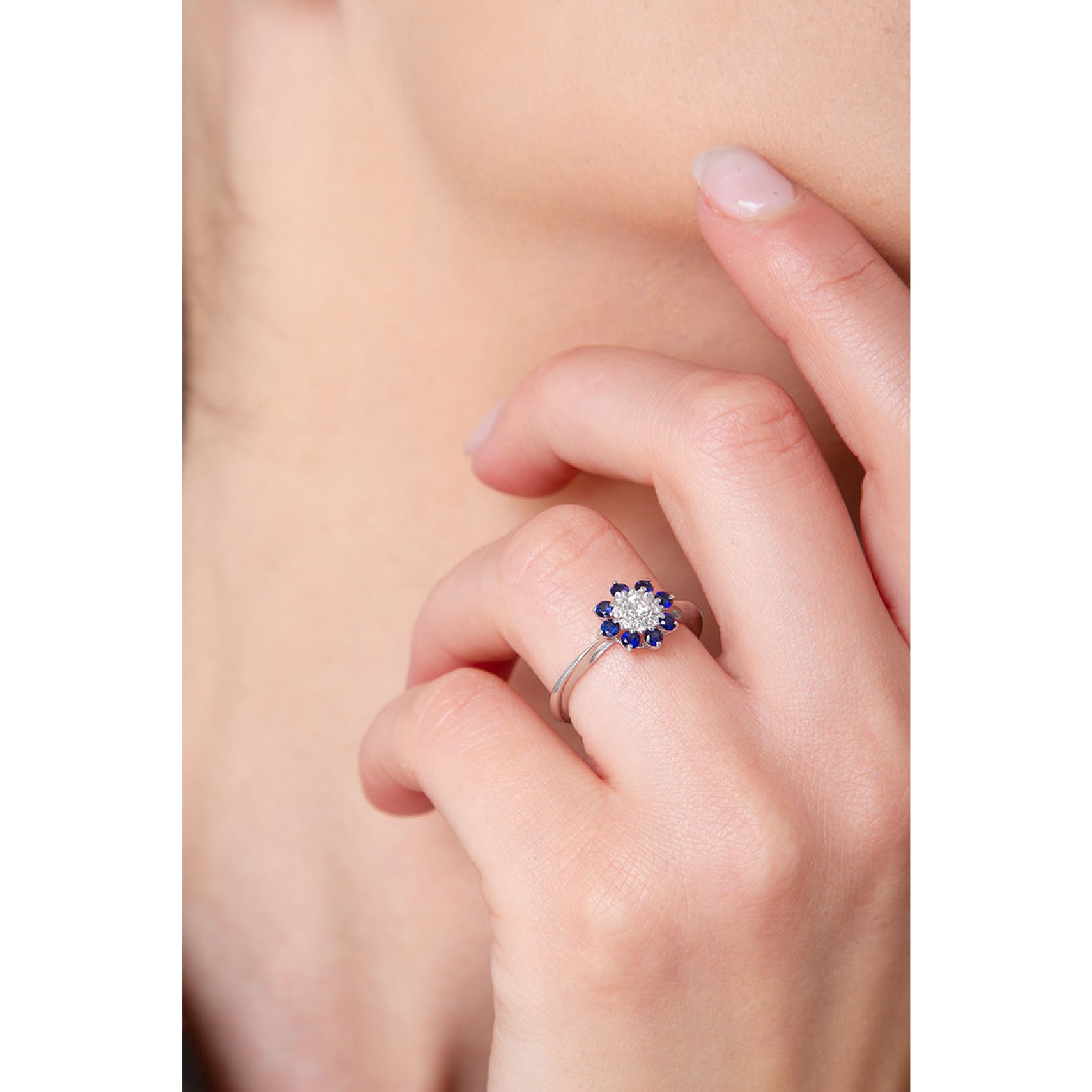 Anillo flor Oro Blanco 18k con Diamantes y Zafiros Azules
