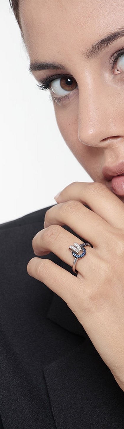 Anillo Nudo en Oro Blanco 18k con Diamantes y Zafiros Azules