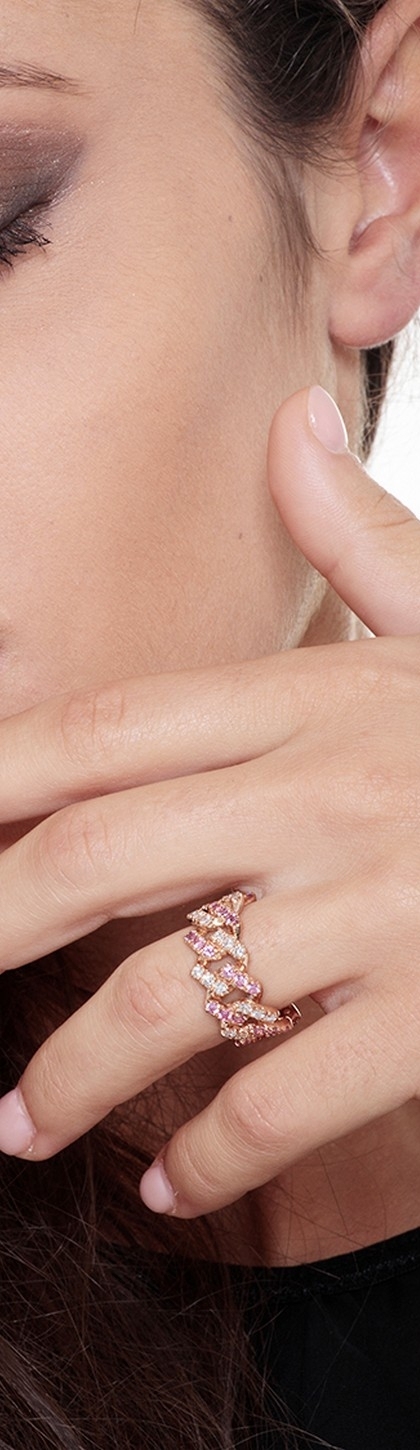 Anillo Cuban Link en oro rosa 18k con zafiros rosa y diamantes