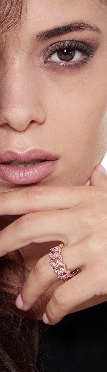 Anillo gourmette en oro rosa de 18 quilates, con zafiros rosas de corte brillante engastados. Ancho de la malla: 10 mm.