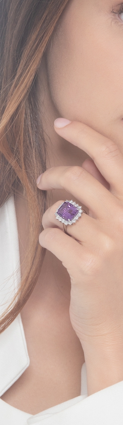 Anillo con amatista rectangular y diamantes brillantes