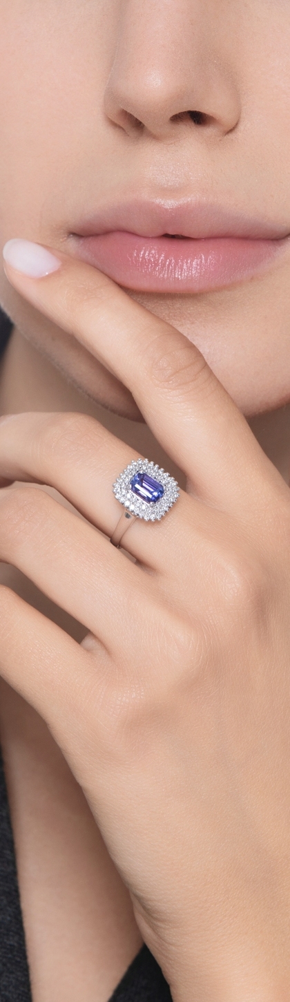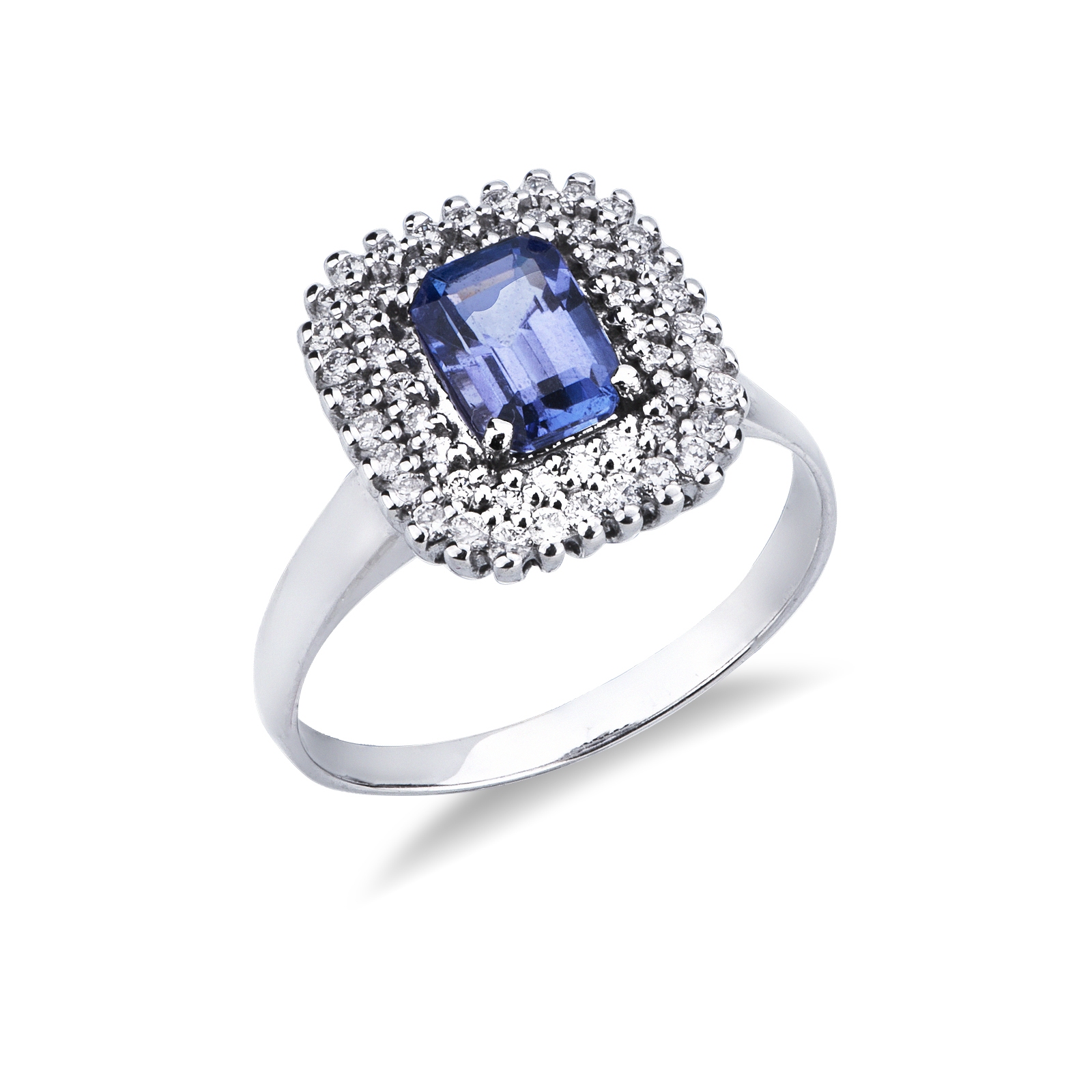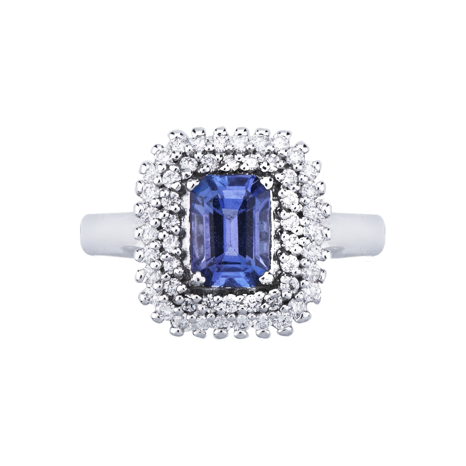 Anillo con doble halo en oro 18k con tanzanita rectangular y diamantes