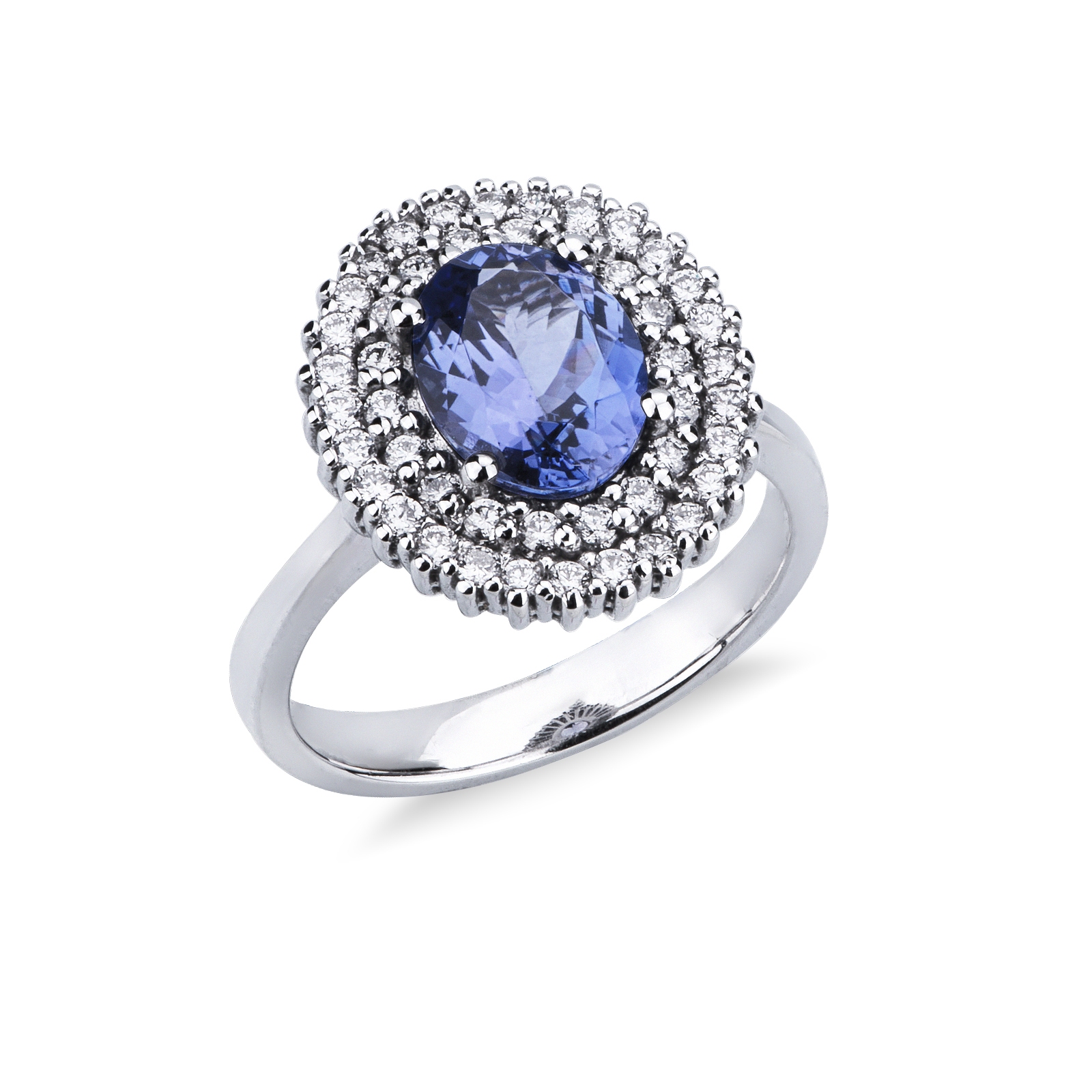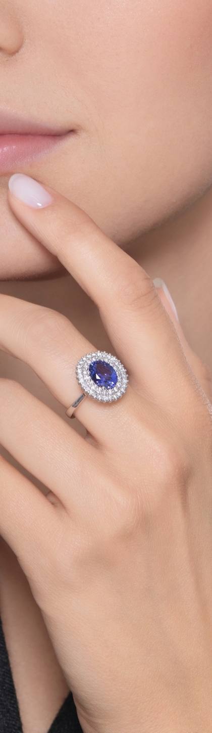 Anillo con doble halo en oro blanco de 18 quilates con tanzanita ovalada y diamantes