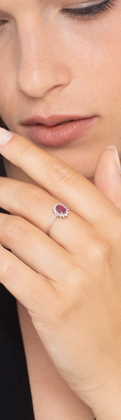 Anillo con halo de diamantes y rubí oval en oro blanco de 18 kilates