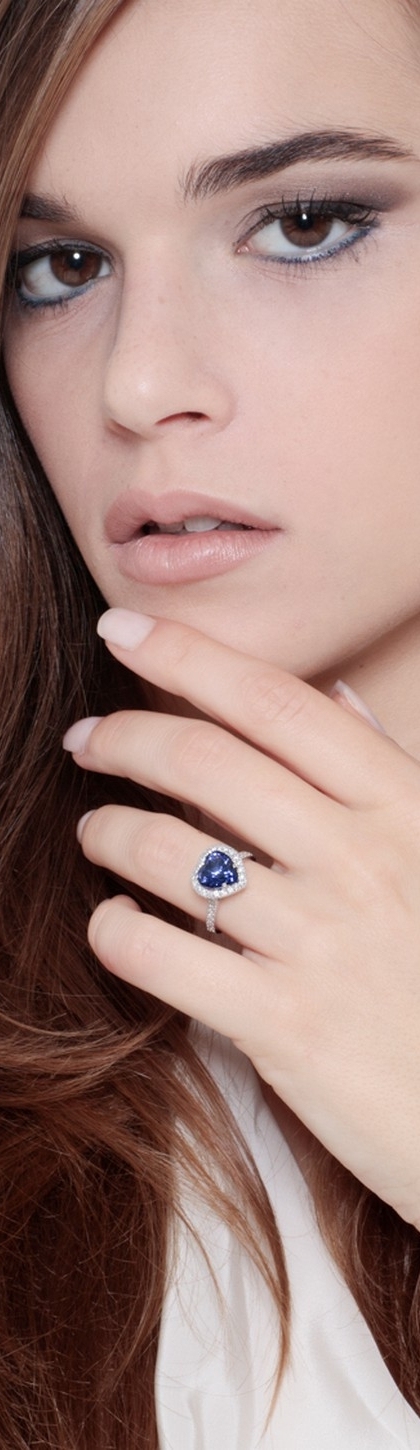 Anillo con pavé de diamantes y corazón central de zafiro y oro blanco 18 kilates