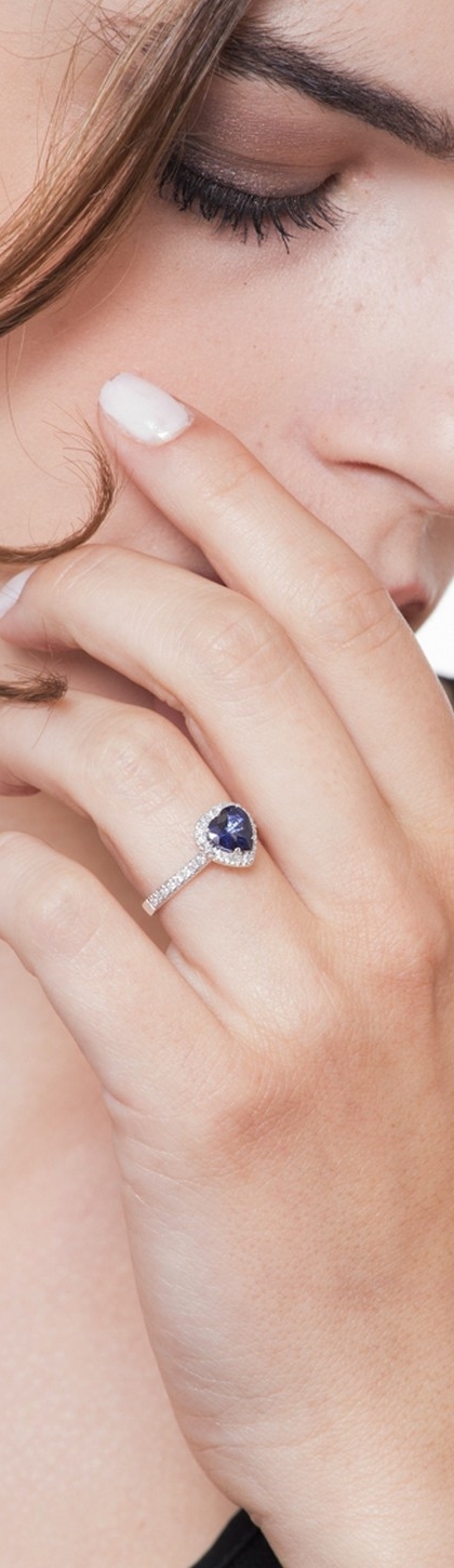 Anillo con zafiro azul en forma de corazón engastado con diamantes oro blanco 18 kilates