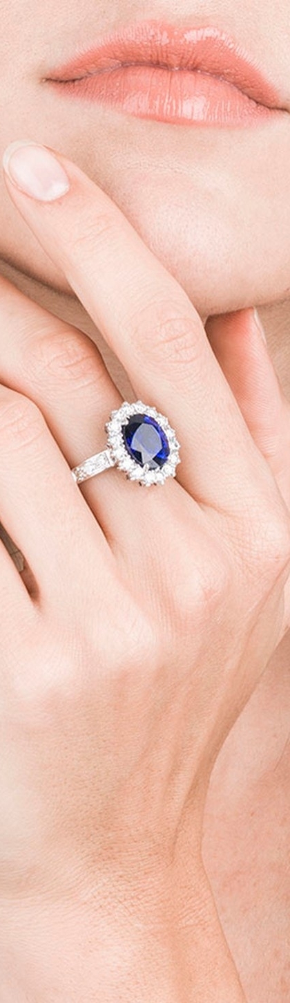 Anillo con zafiro azul ovalado y diamantes en oro blanco 18K