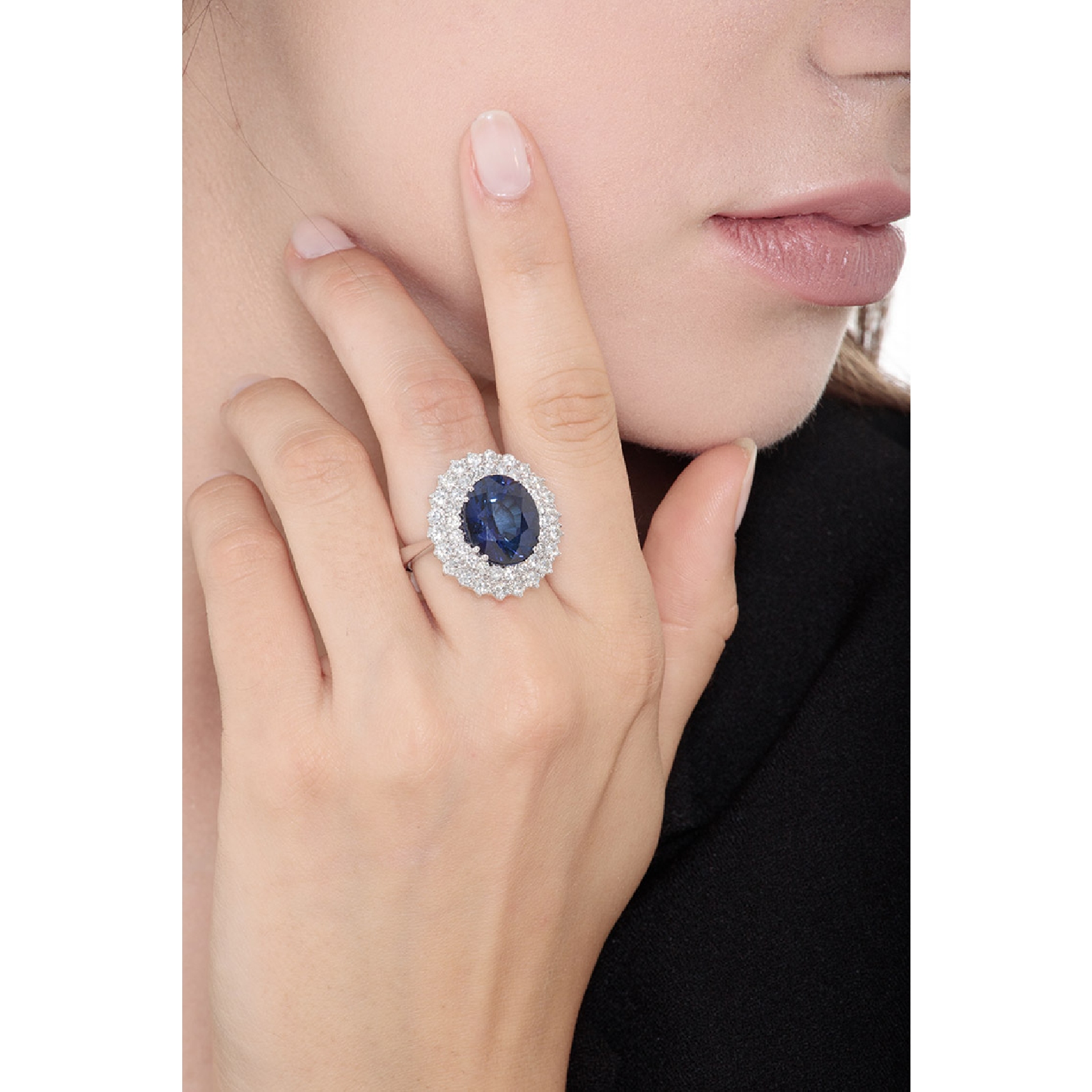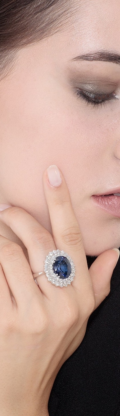 Anillo contorno en oro blanco 18k con zafiro azul oval de 14x12 mm y doble halo de diamantes talla brillante color H y pureza VS. Elegante y sofisticado, ideal para ocasiones especiales o como anillo de compromiso.