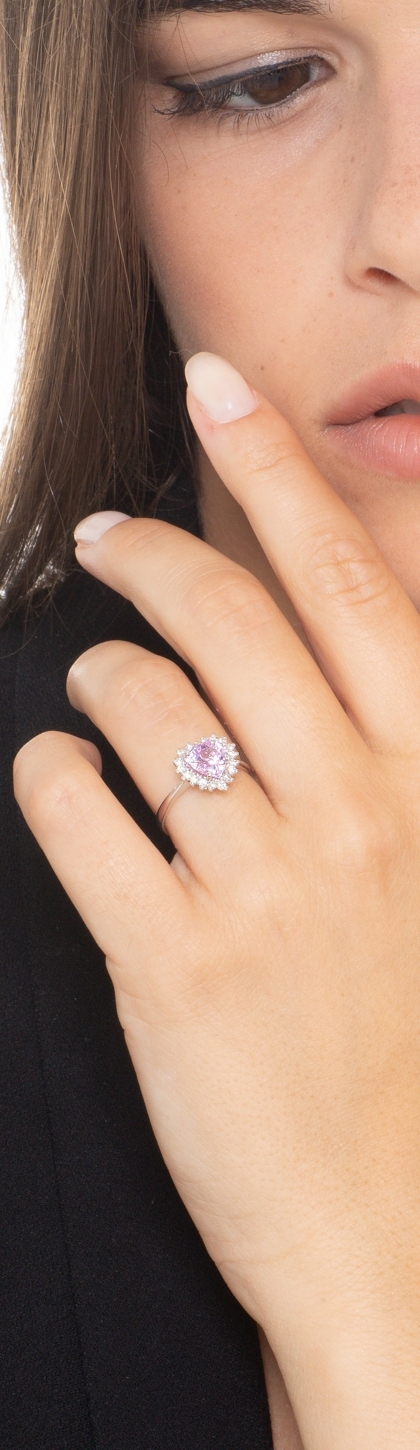 Anillo corazon oro blanco 18k con zafiro rosa y diamantes