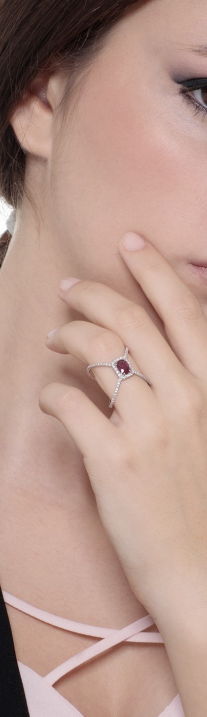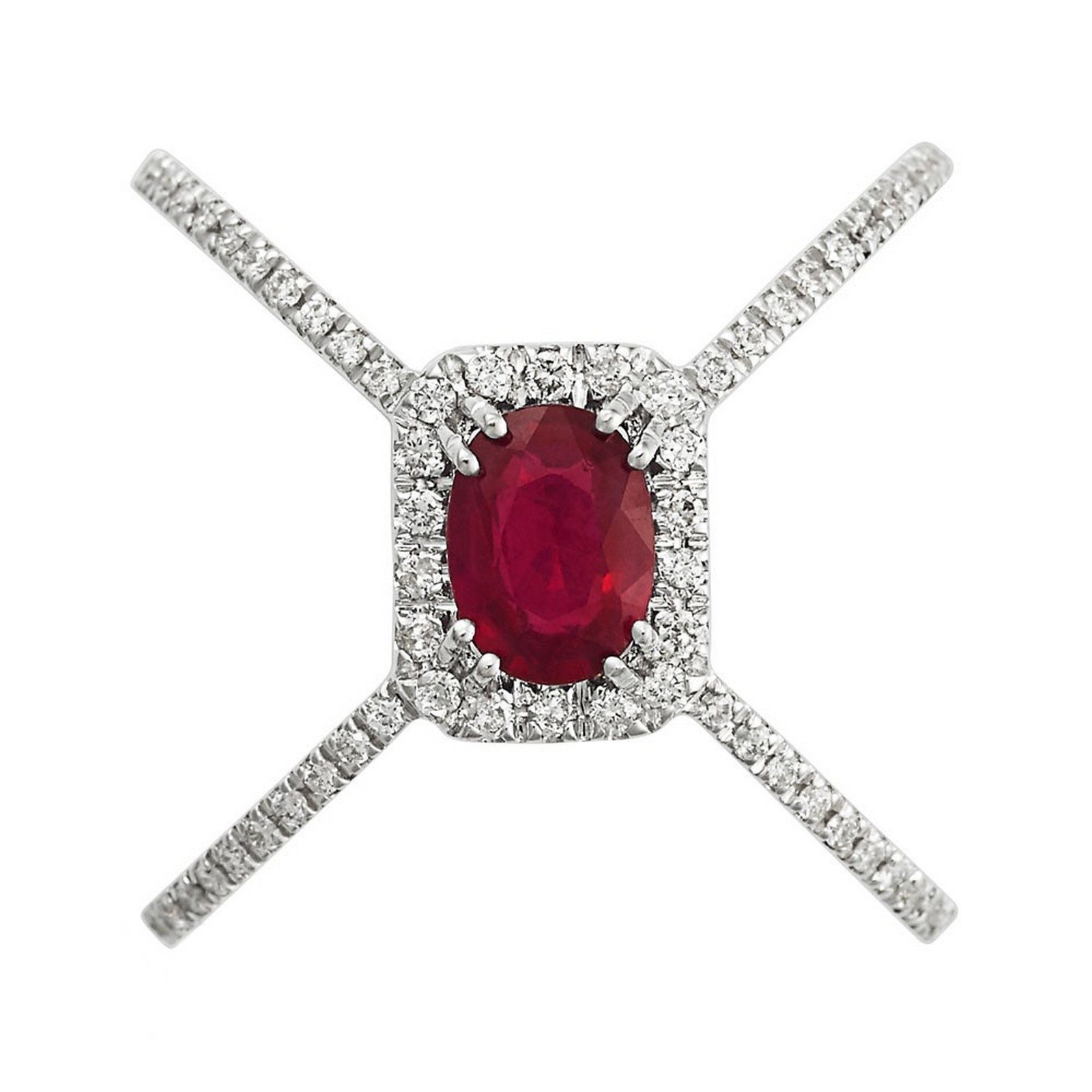Anillo cruzado en oro blanco 18k con rubí oval y diamantes