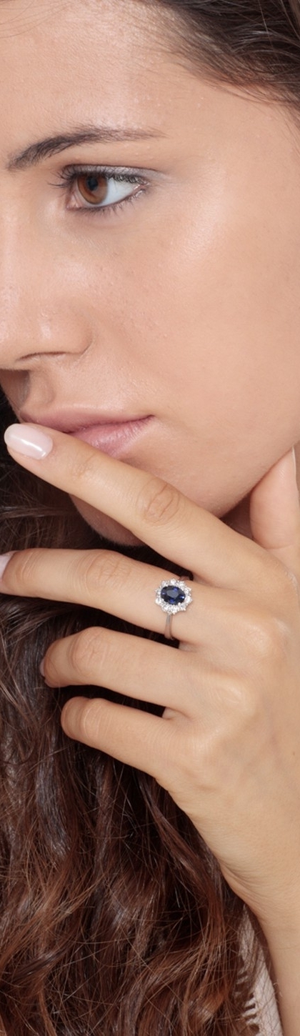 Anillo de oro blanco 18k con zafiro azul ovalado y halo de diamantes