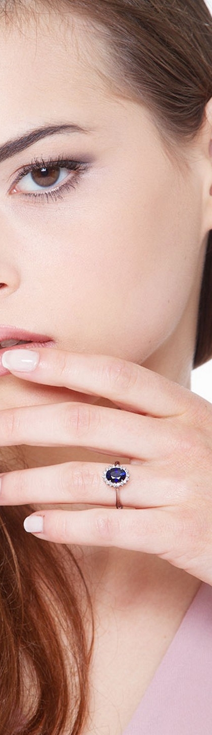 Anillo de oro blanco de 18 kilates con diamantes y zafiro avul ovalado