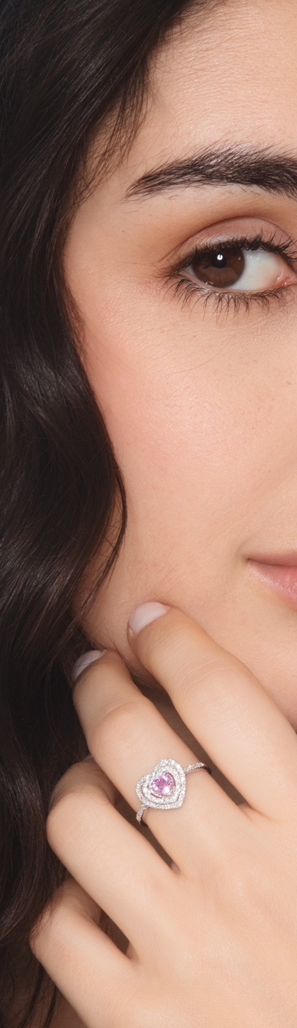 Anillo en forma de corazón en oro blanco de 18k con zafiro rosa