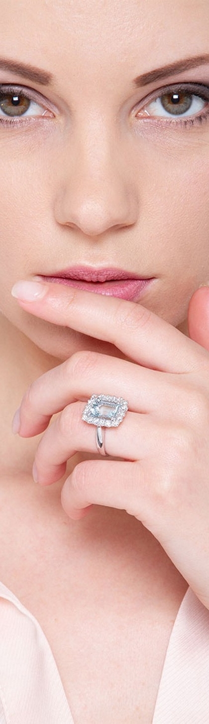 Anillo en oro blanco 18k con aguamarina y halo en diamantes