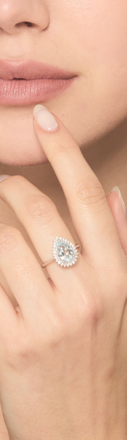 Anillo en oro blanco 18k con aquamarina gota halo diamantes
