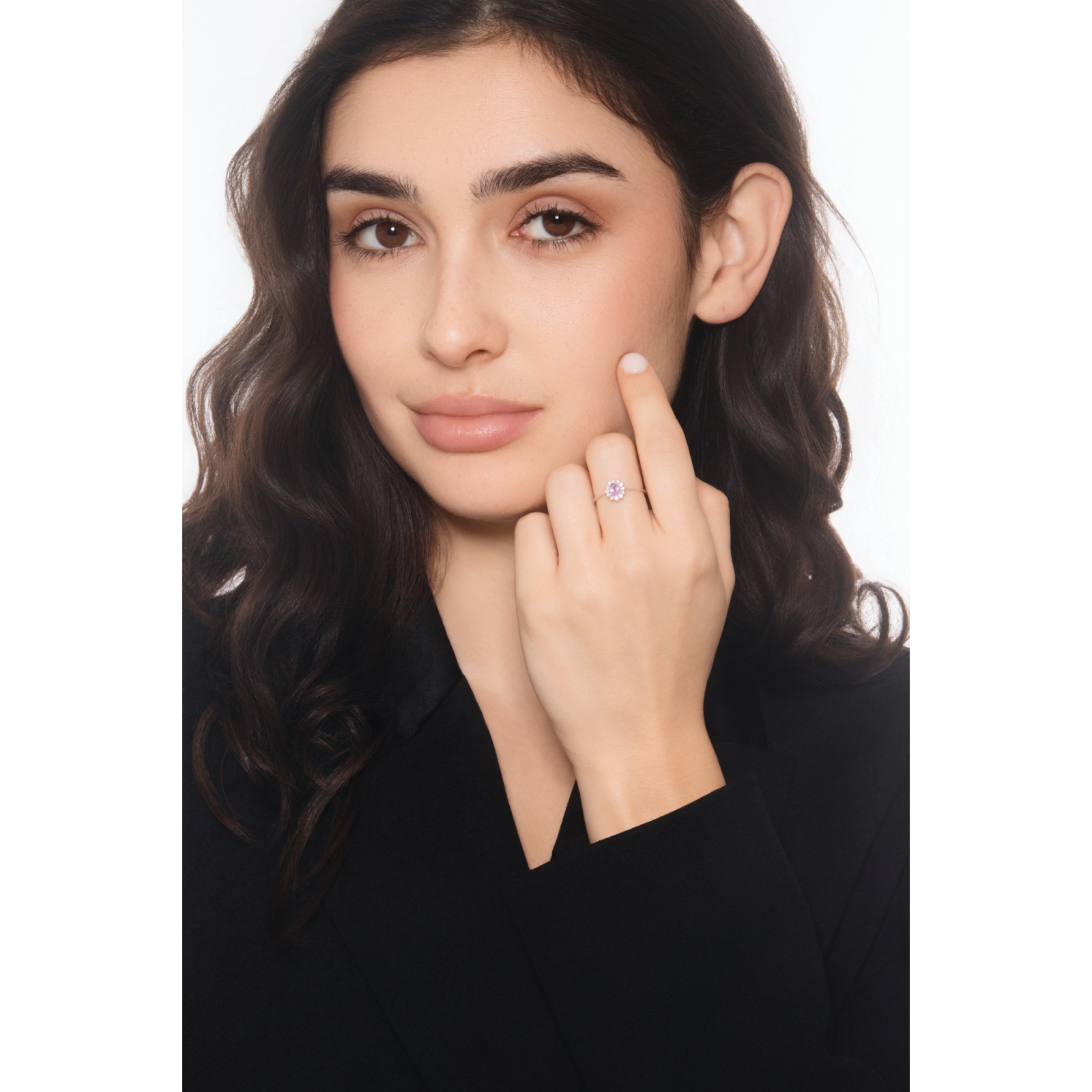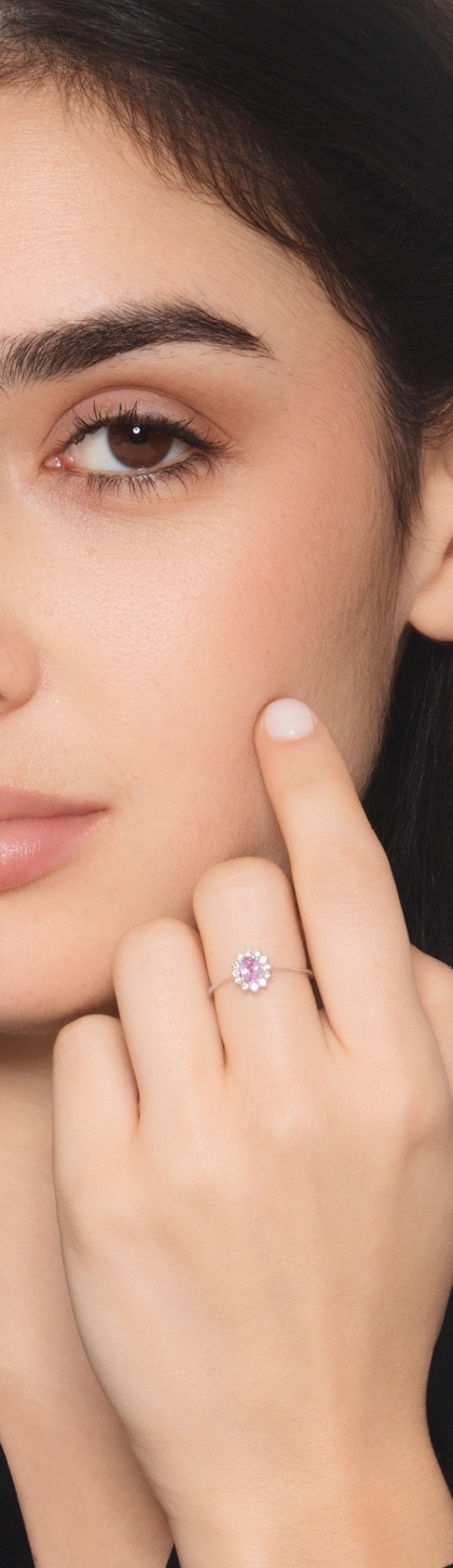 Anillo en oro blanco 18k con halo zafiro rosa y diamantes
