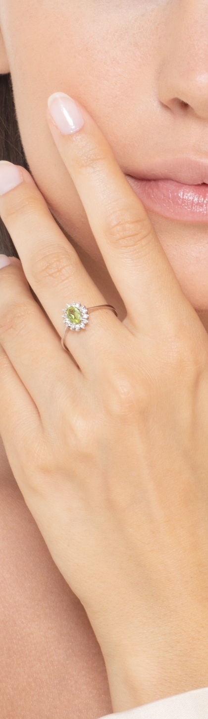 Anillo en oro blanco 18k con peridoto ovalado y diamantes