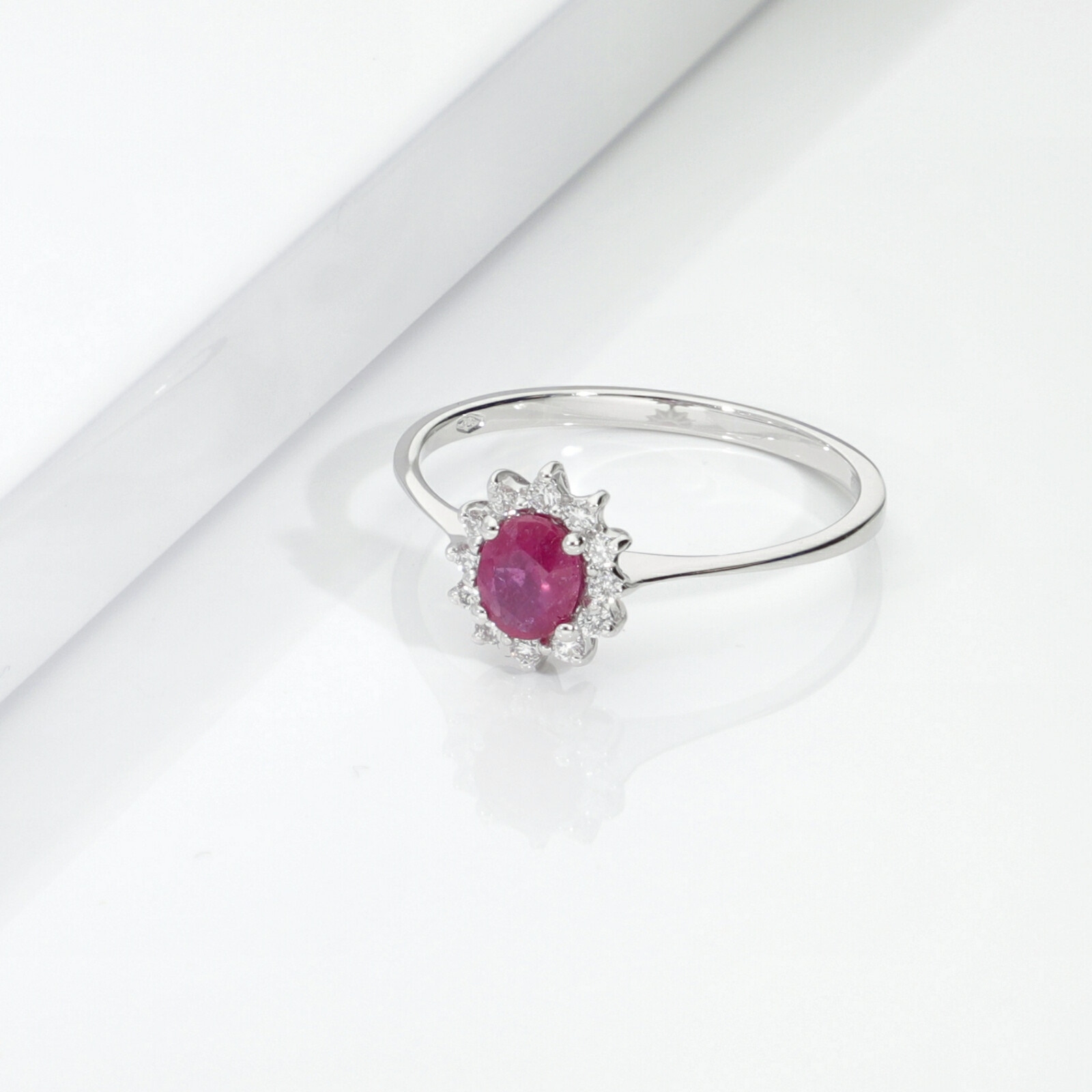 Anillo en oro blanco 18k con rubí 5x4 mm y diamantes