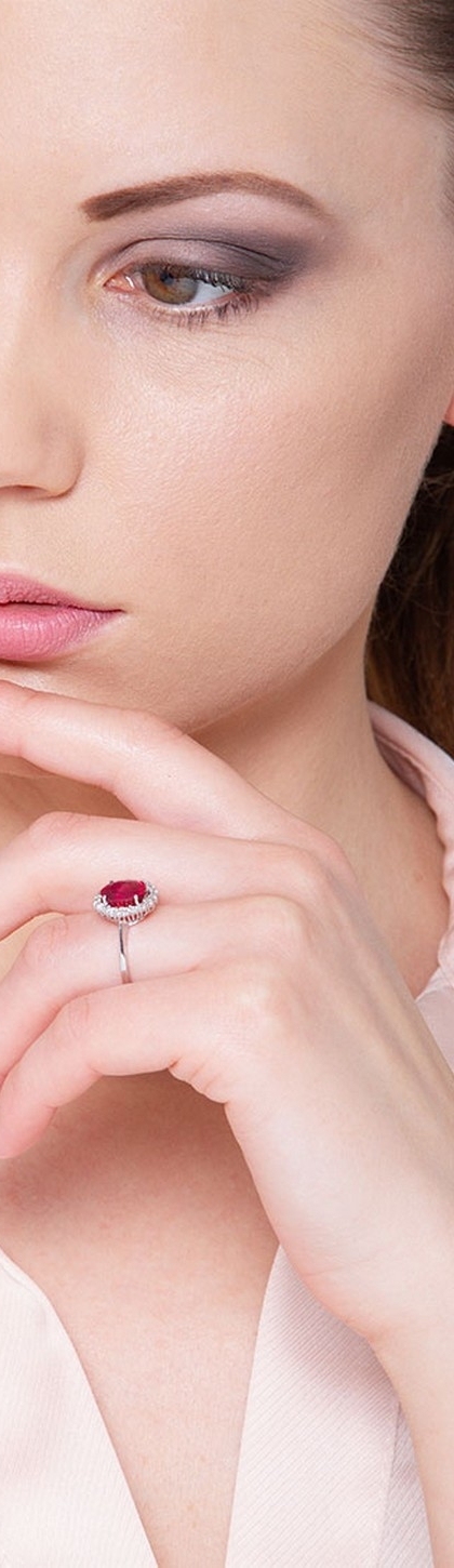 Anillo en oro blanco 18k con rubí y halo diamantes
