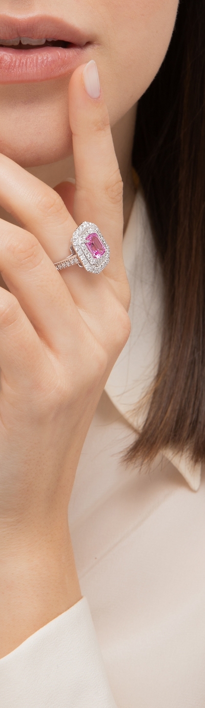 Anillo en oro blanco 18k con zafiro rosa rectangular y diamantes