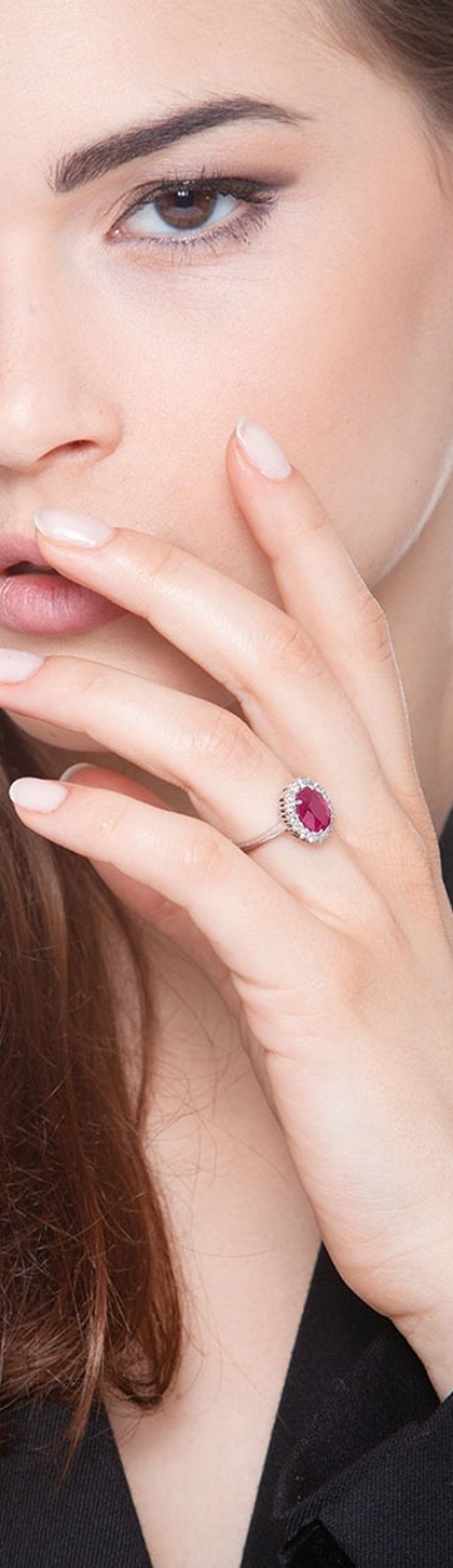 Anillo en oro blanco 750 con rubí ovalado y contorno de diamantes