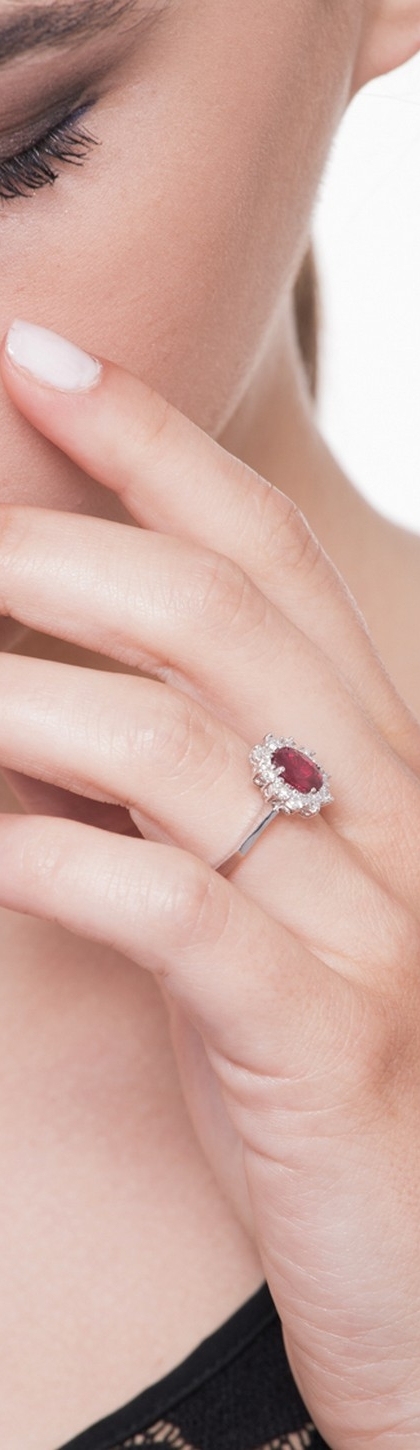 Anillo en oro blanco de 18 kilates con rubí oval y halo de diamantes