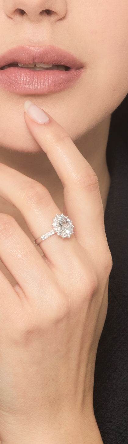 Anillo en oro blanco de 18k con aquamarina ovalada y halo diamantes