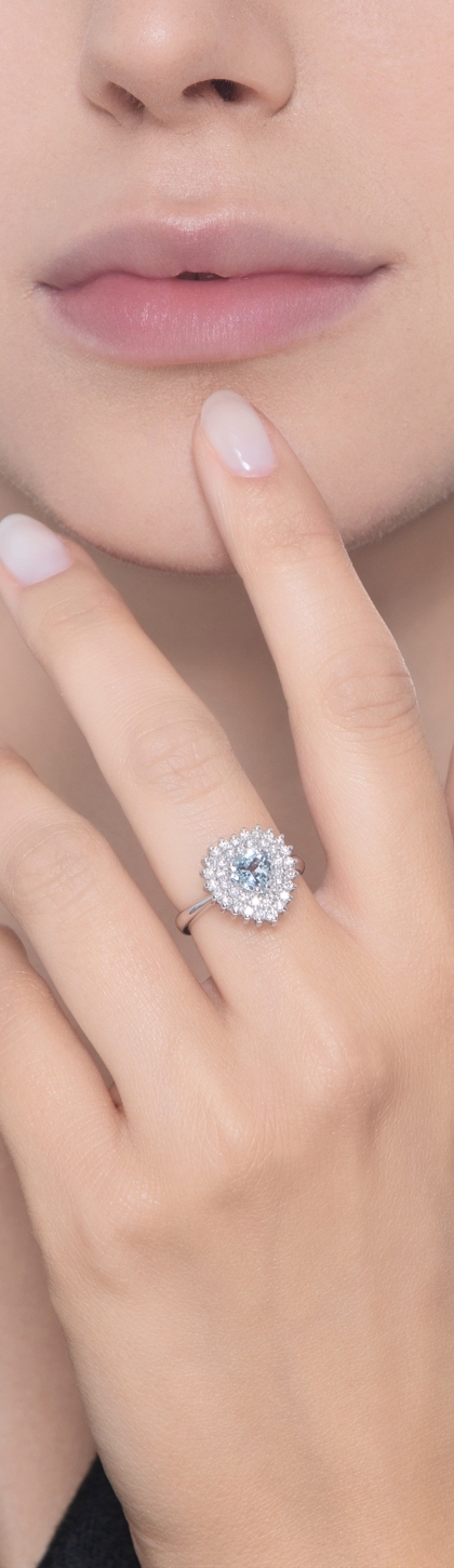 Anillo en oro blanco de 18k con una hermosa aguamarina y halo diamantes