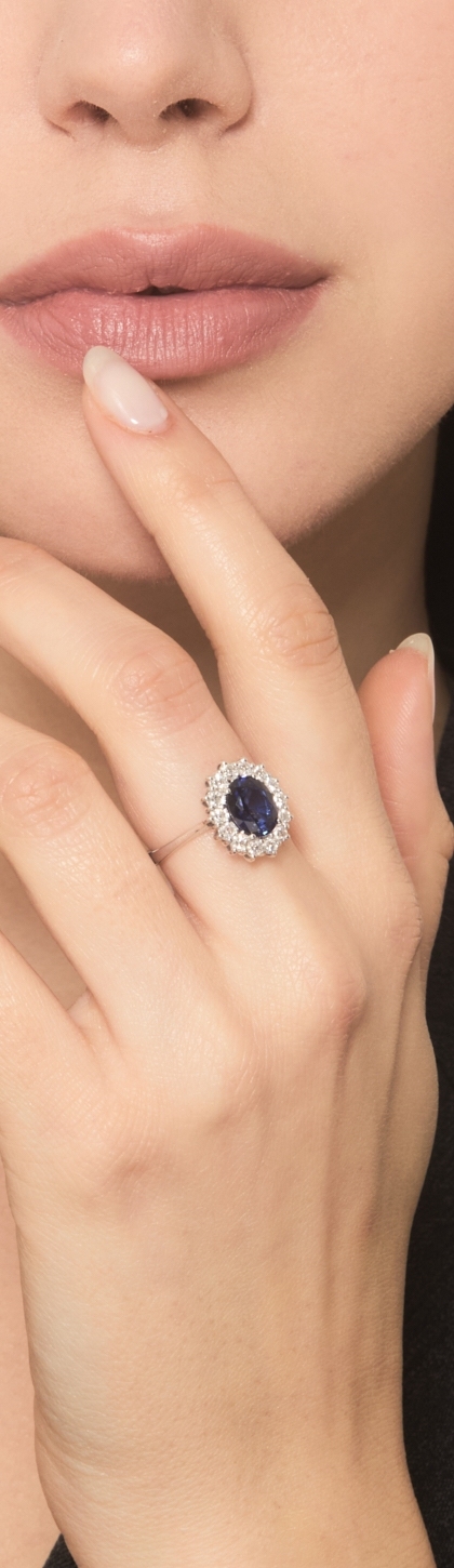 Anillo en oro blanco de 18k con zafiro azul ovalado con diamantes