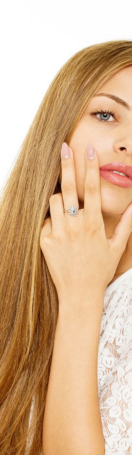 Elegante anillo de mujer en oro blanco 18k con aguamarina central talla oval, rodeada por un luminoso contorno de diamantes talla brillante de color H y pureza VS. Un diseño delicado y sofisticado que realza la frescura del color aguamarina y el brillo de los diamantes, ideal para una joya refinada y atemporal.