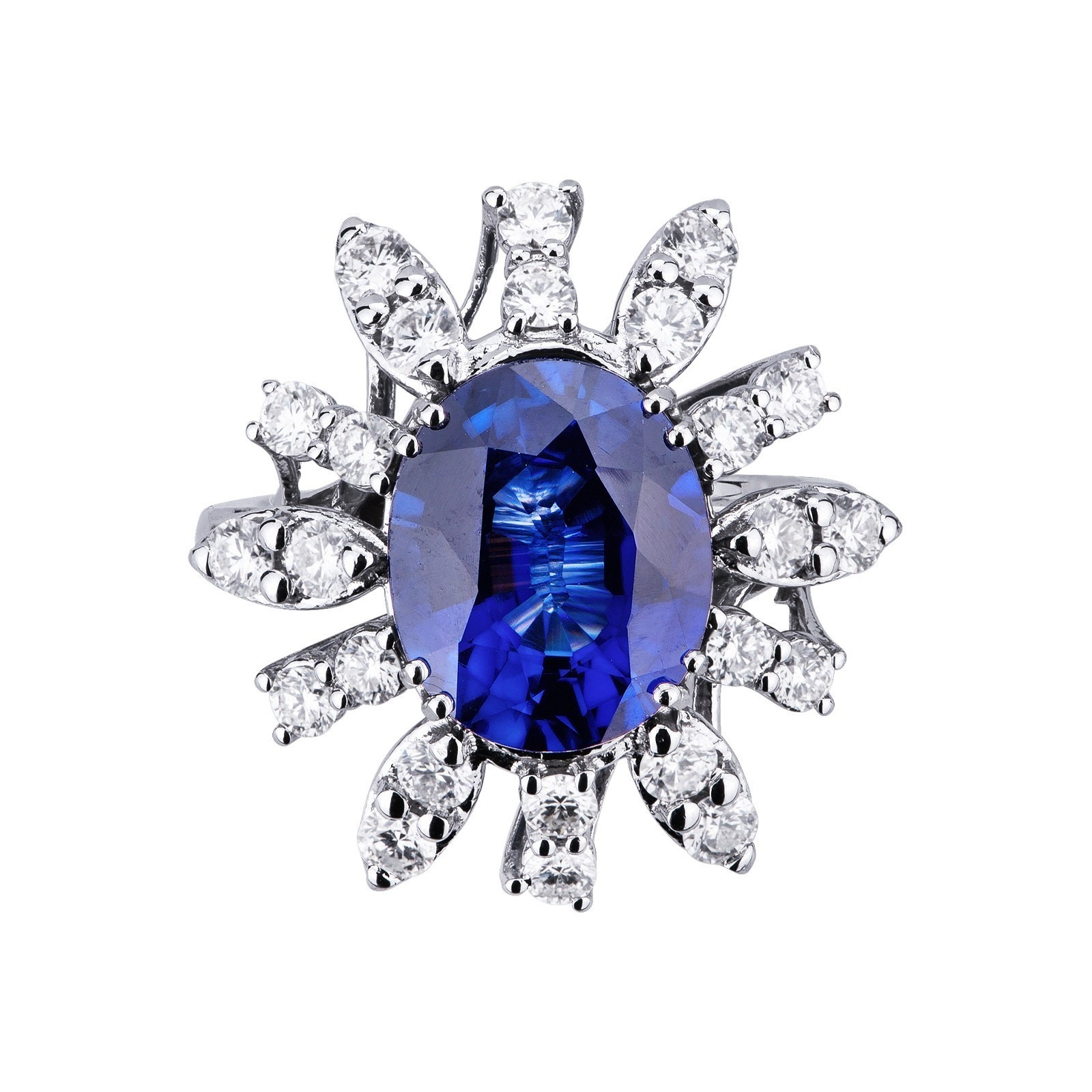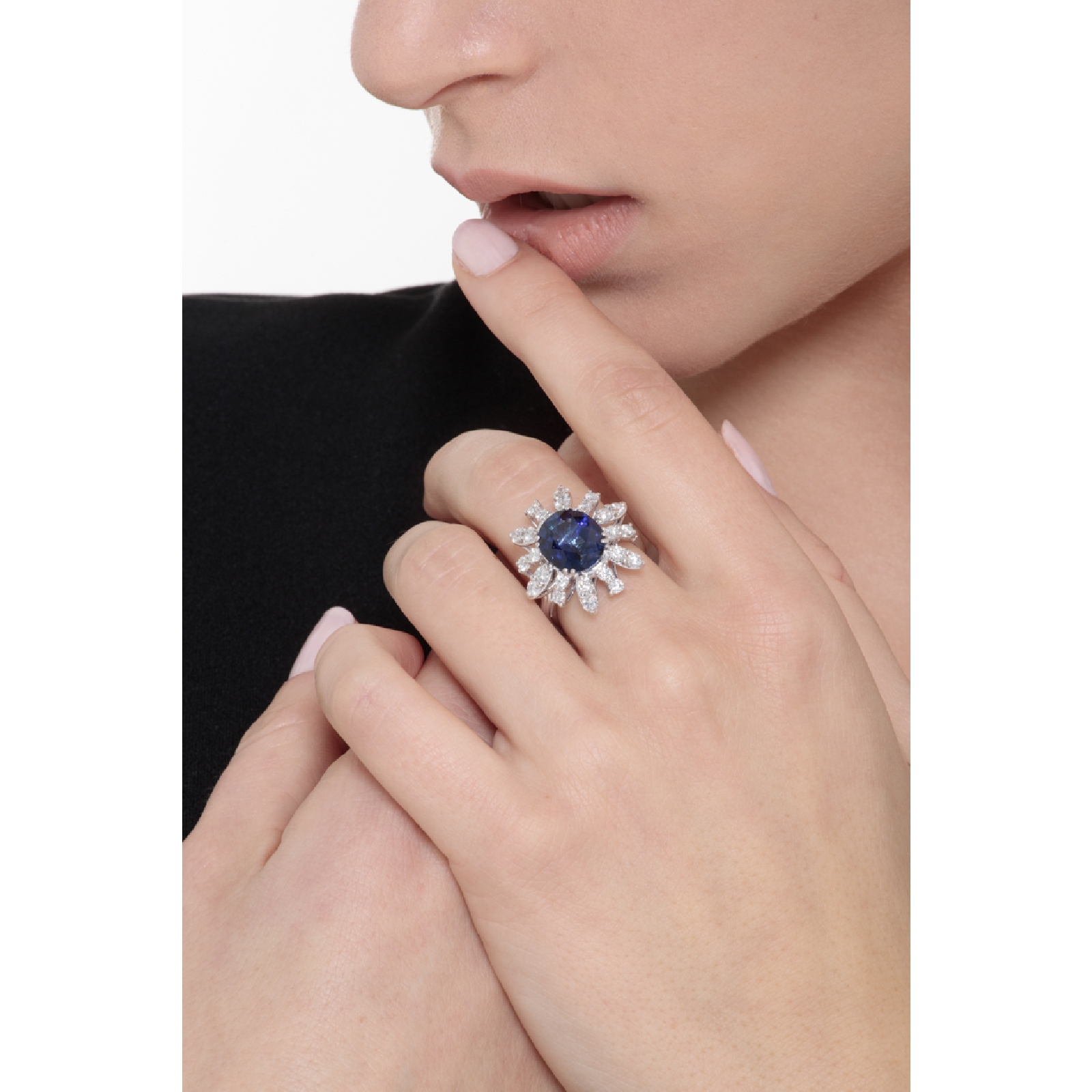 Anillo halo diamantes en oro blanco 18k con zafiro azul
