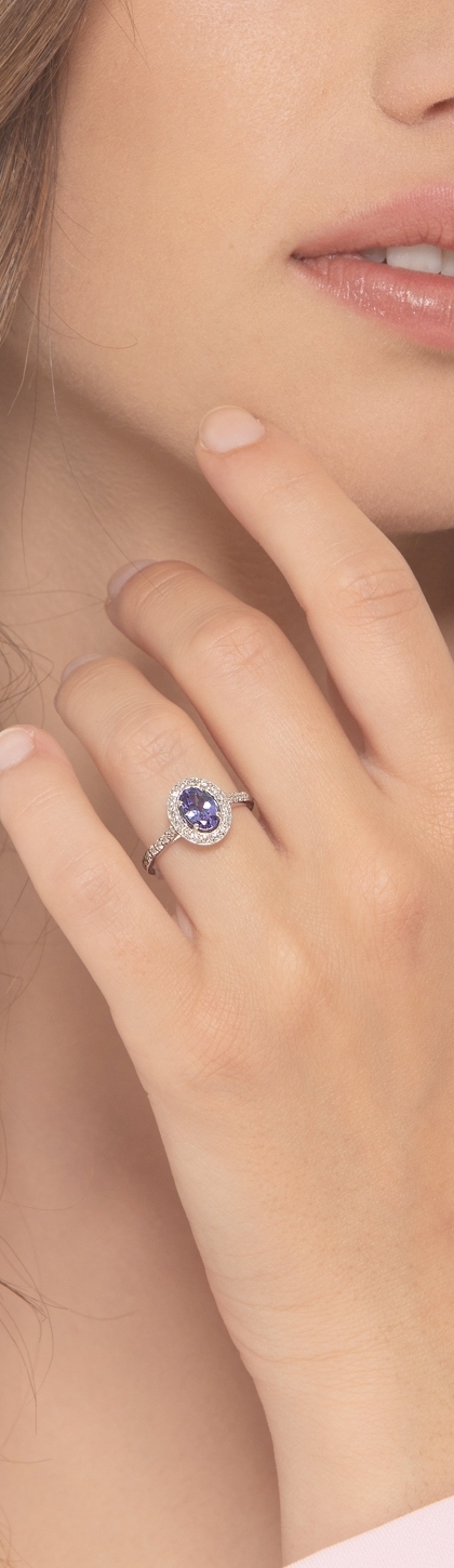 Anillo halo en oro blanco 18 quilates con tanzanita ovalada
