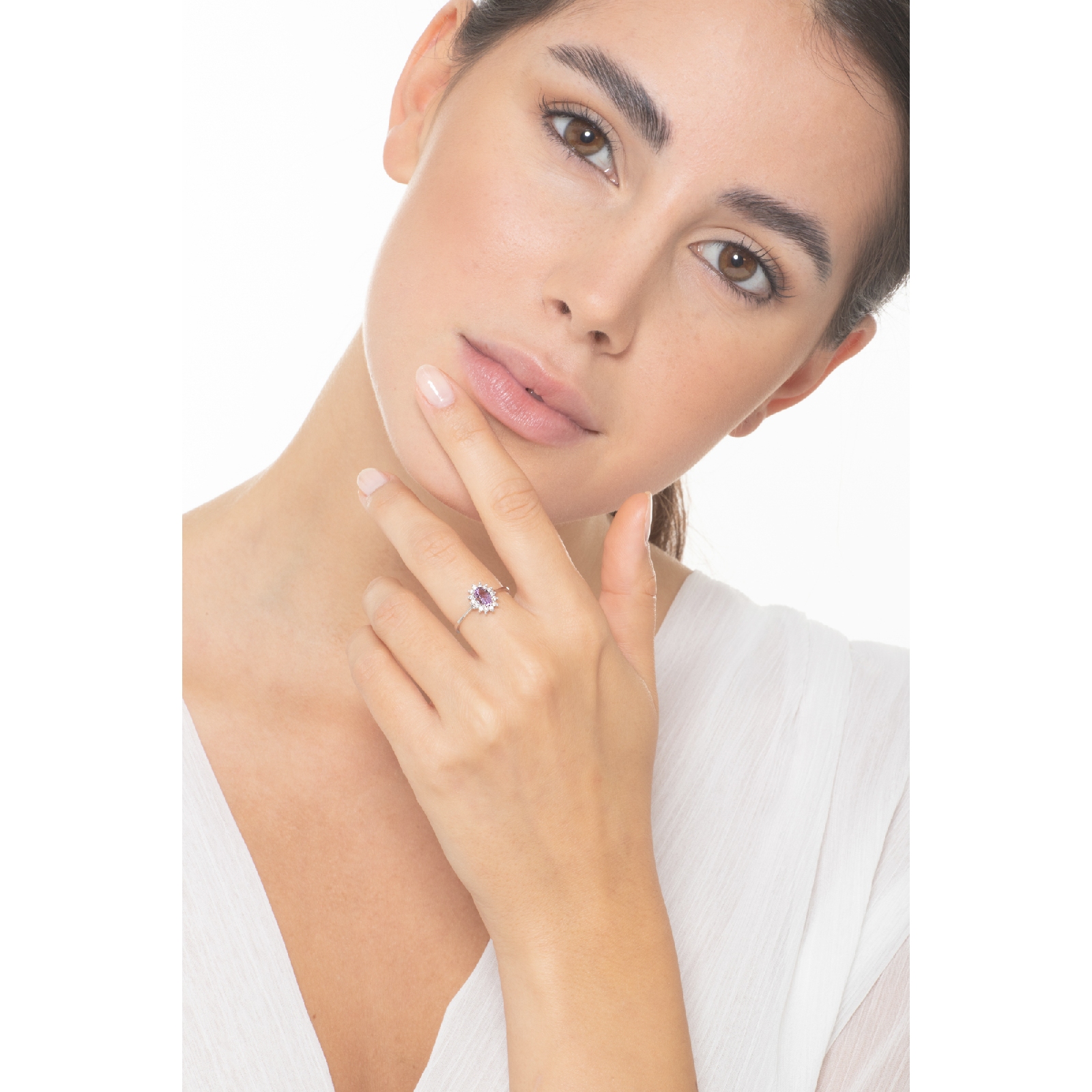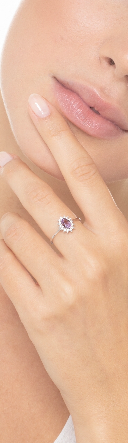 Anillo halo en oro blanco 18k con amatista y diamantes
