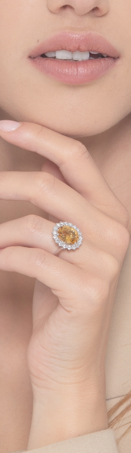 Anillo halo en oro blanco 18k con citrino ovalado y diamantes