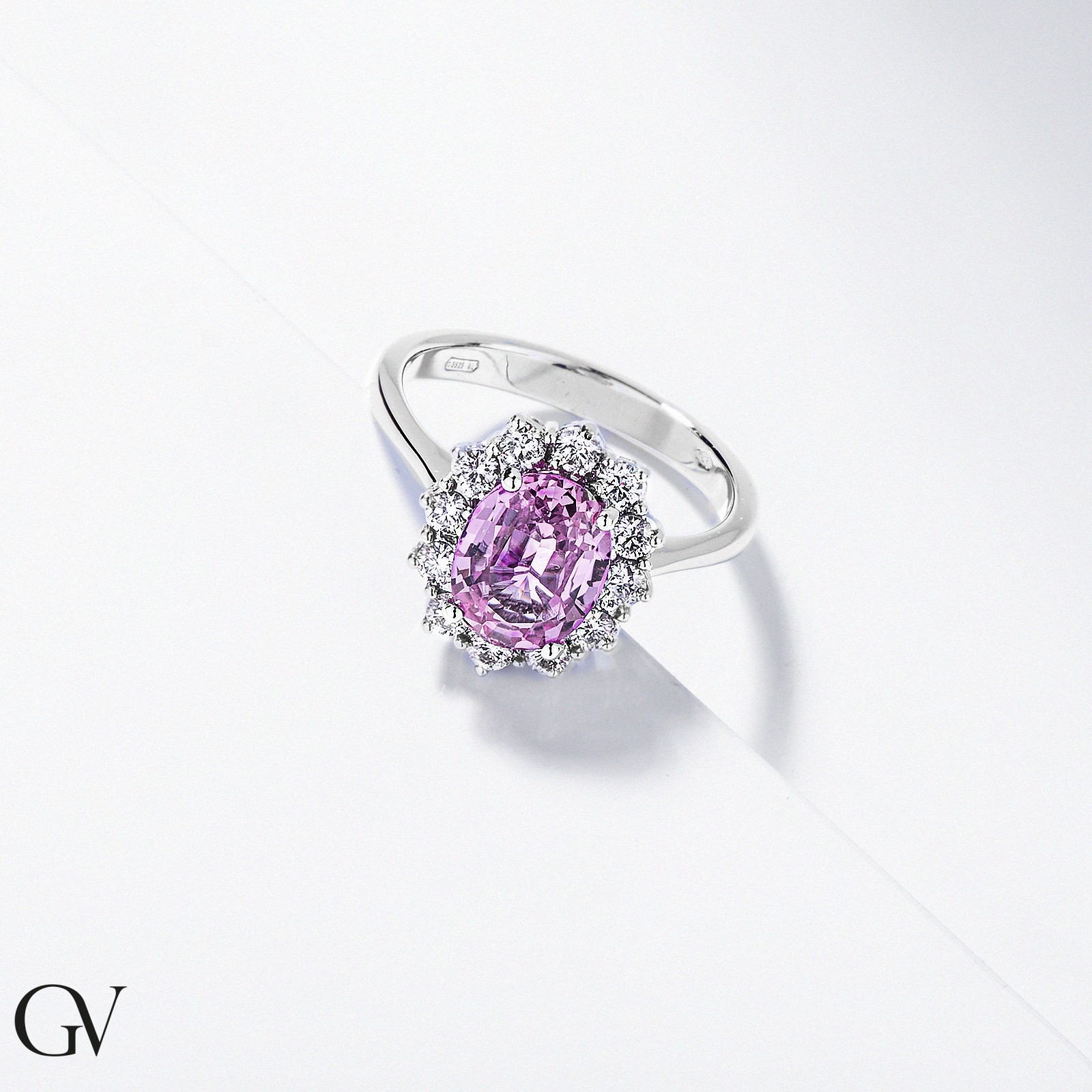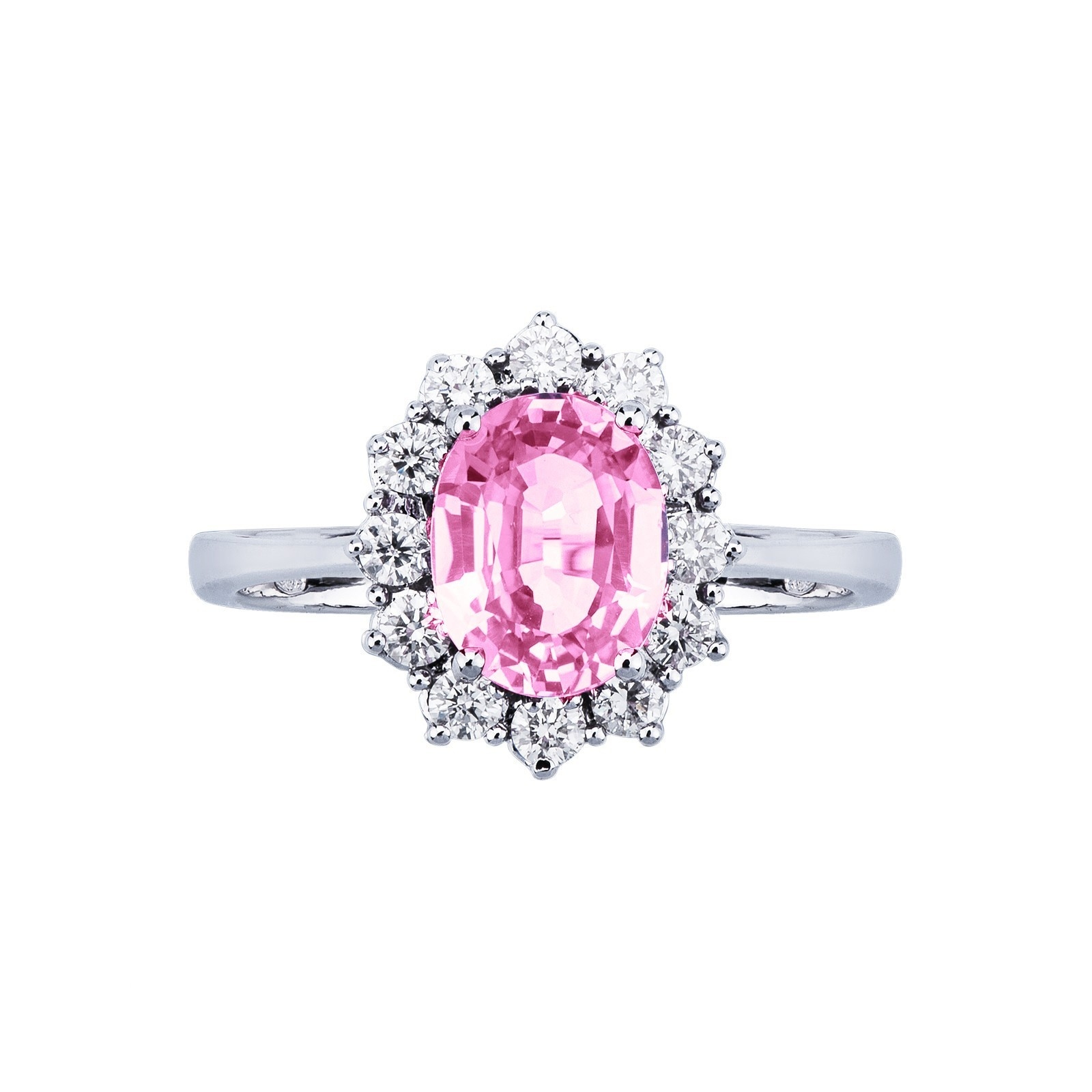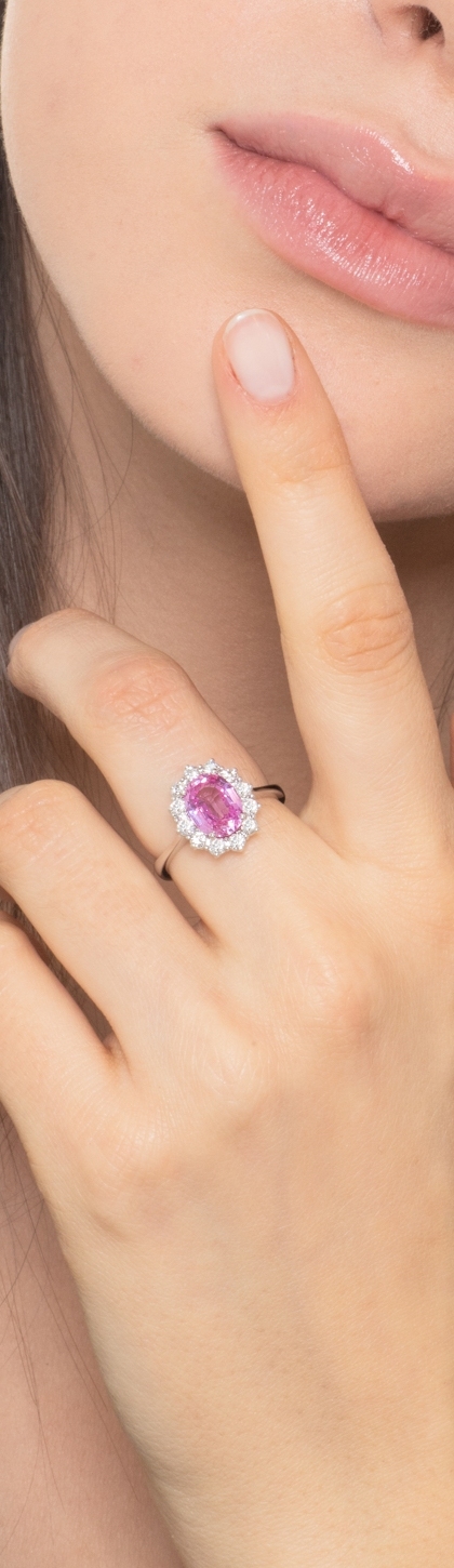 Anillo halo en oro blanco 750 con zafiro rosa y diamantes